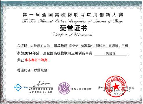 第一届高校物联网应用创新大赛华东赛区二等奖(2014)