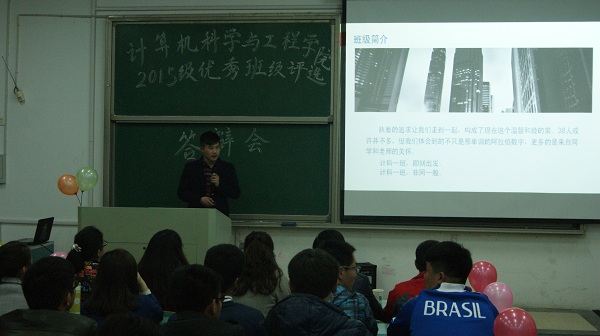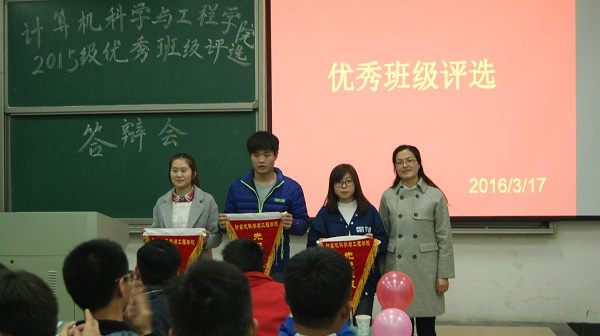 会上,2015级各班员工代表按照抽签顺序依次上台进行汇报,以学风建设、日常管理、学习活动、特色工作为主线,通过精美的PPT展示、精彩的视频短片和富有激情的解说,向大家展示了在过去一学期班级的学习成果,分析了存在的问题及不足,展现了各班同学团结合作、积极进取、乐观向上的良好精神面貌。经过紧张激烈的评比,最终,数字媒体15-1班、信息安全15-1班、计算机15-4班获得了“先进班级”荣誉称号。
